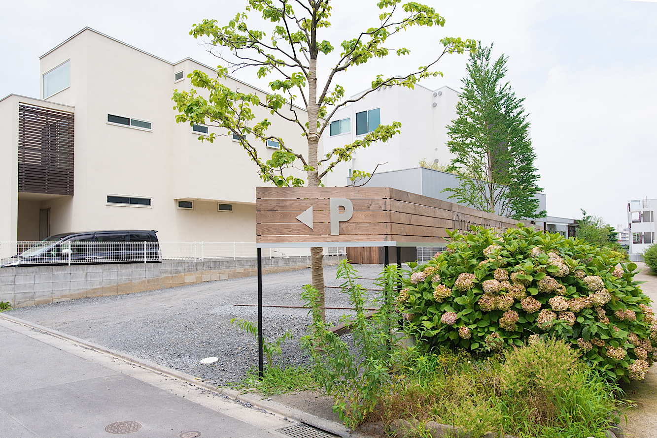 茶色の看板とハナミズキが目印です。